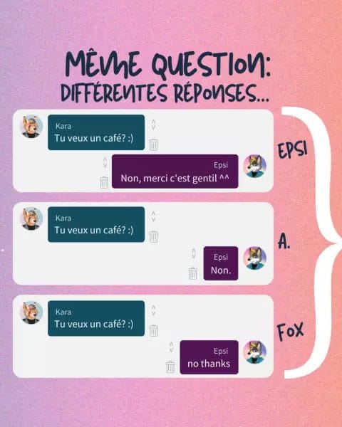 Ça peut aussi être différent au niveau de la ponctuation, de l’orthographe, l’utilisation d’emoji ou de GIF (ouais on dit GIF et quoi ? ^^), et plein d’autres possibilités de ce genre